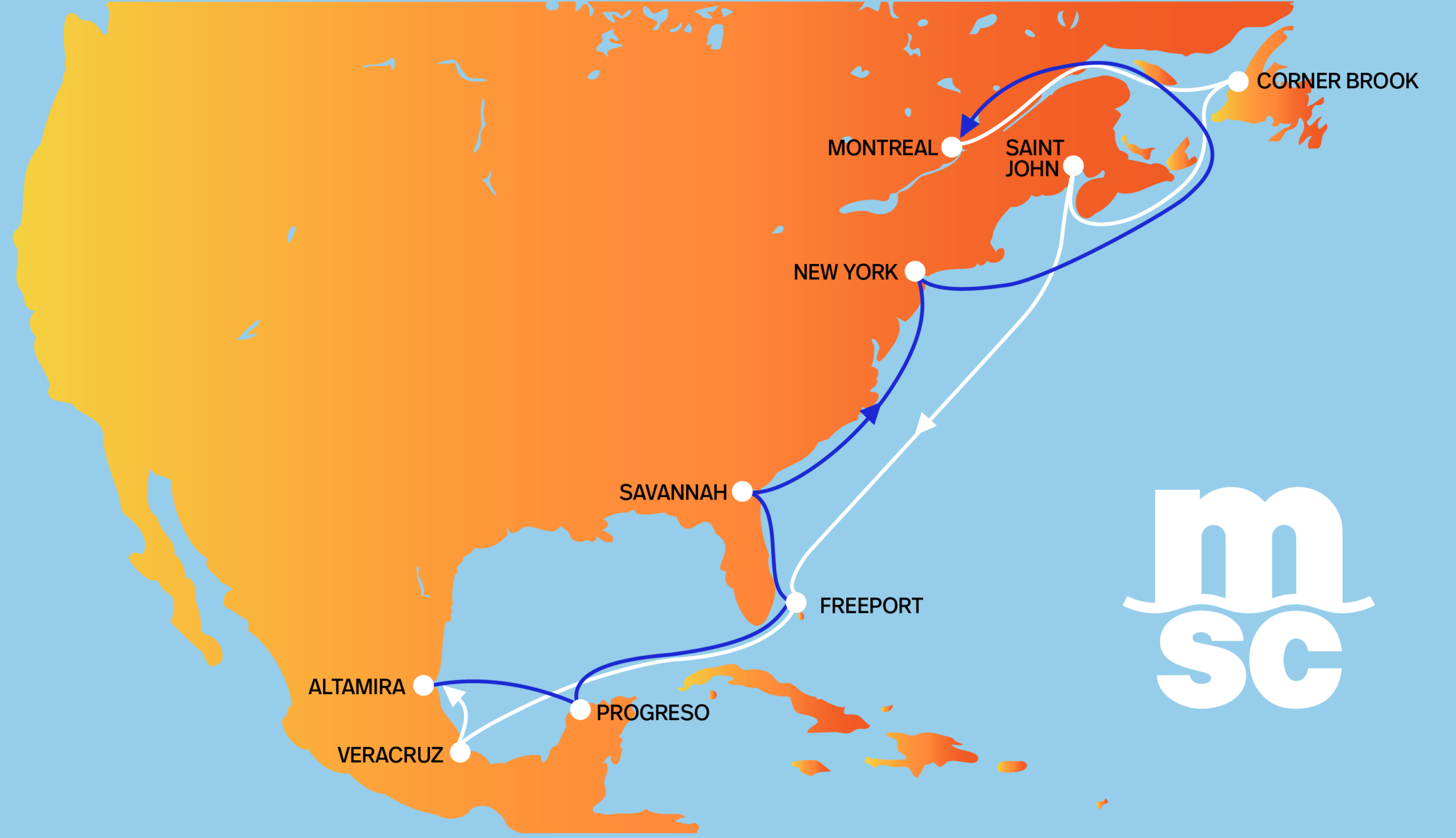 The Canada Gulf Bridge Service operates weekly out of the Port of Corner Brook. Once loaded, containers are transported to Freeport, Grand Bahama, The Bahamas, which serves as a major hub for the worldwide transshipment of containerized cargo. From there, containers are delivered to their final destinations around the globe.